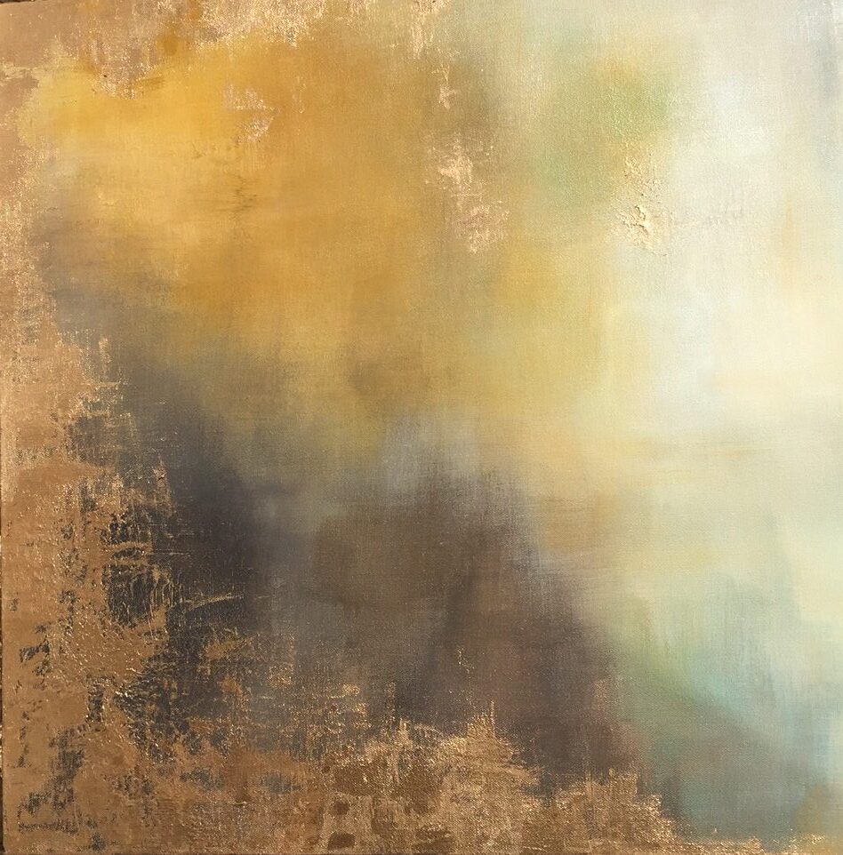One of the first pieces of artwork that caught our eye was this large gold abstract piece that features tinges of gold and white. The way the strokes of gold catch the light is quite arresting, and we wanted to play with that idea a bit more. Since gold immediately invokes images of luxury and elegance, it was easy to come up with an interior design fit to match.